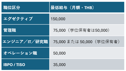 2025年から2026年にかけて、BOI(タイ投資委員会)では外国人雇用に関する規定の改定が行われ、最低給与基準およびタイ人雇用比率が明確化されました。